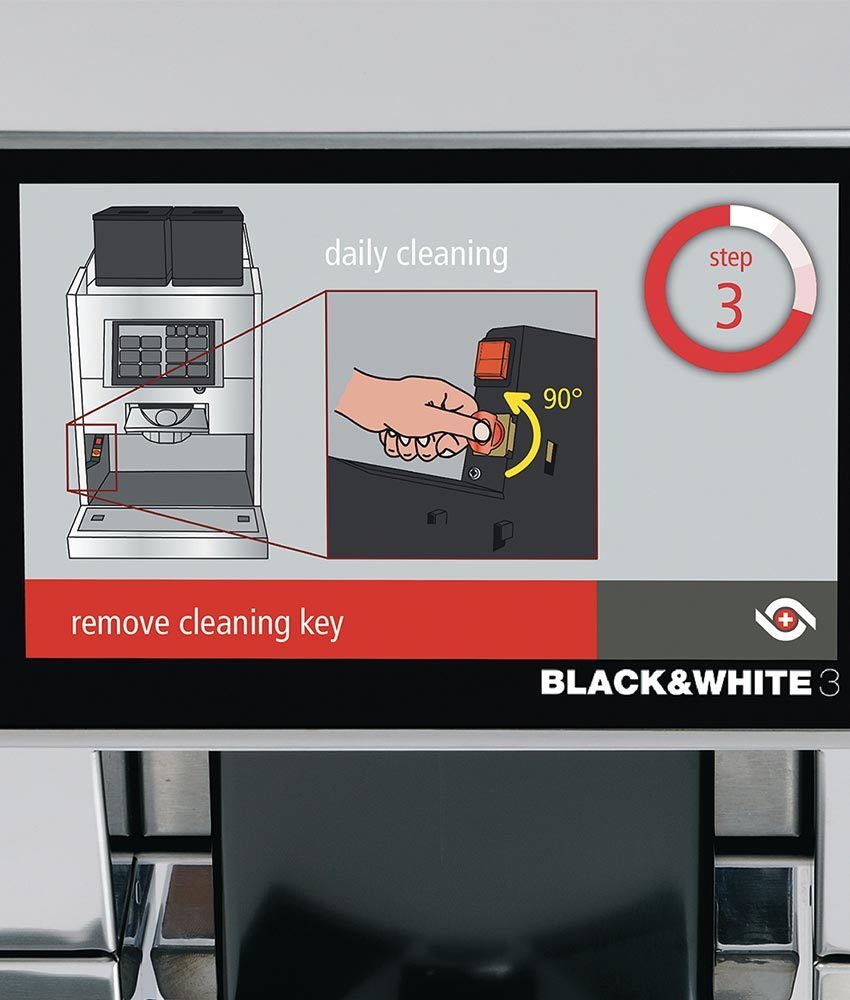 - Làm sạch máy pha cà phê hoàn toàn tự động, nhanh chóng, đơn giản và sạch hoàn hảo. Chương trình làm sạch tự động của Black & White3 bắt đầu bằng cách nhấn nút và được người dùng điều khiển thông qua màn hình. Việc sử dụng chìa khóa làm sạch giúp việc vệ sinh trở nên dễ dàng hơn. Và Black & White3 trở lại sử dụng ngay lập tức.